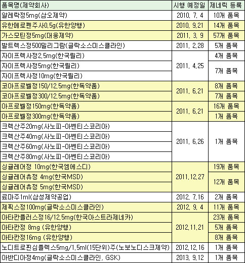 특허만료가 가장 빠른 제품은 알레락정과 유한메로펜주사, 가스모틴정 등이다. 알레락정은 오는 7월 4일, 유하메로펜주사는 9월 21일, 가스모틴정은 2011년 3월 9일부터 제네릭 출시가 가능해 진다.