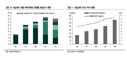 증권업계는 지난해 신종플루 특수를 톡톡히 누리면서 재무가 탄탄해졌다는 점, 백신과 바이오항암체를 중심으로 한 신약 파이프 라인, 백신 등 생물학적제제 실적 증가세 등을 녹십자의 강점으로 꼽고 있다.