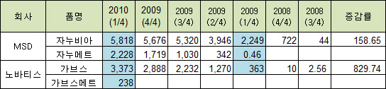 '자누비아'에 비해서는 상승세가 더디지만 작년 1분기 분기매출 3억원대에서 출발해 마케팅이 본격화된 2분기 이후 13억원, 22억원, 29억원 순으로 매출을 올리면서 누적매출 68억원을 달성했다.