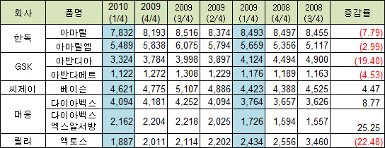 '아마릴엠', '아반다메트' 등 세대교체 주자들도 전년 대비 각각 2.99%, 4.53% 점유율이 감소했다.