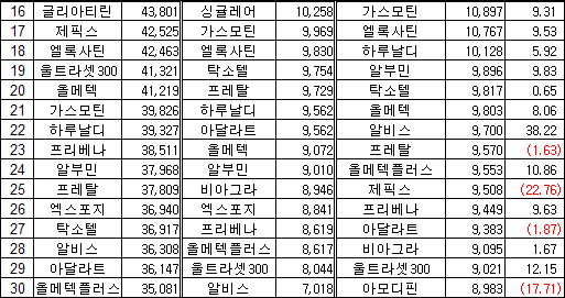 국내사 품목 중에서는 대웅제약 '알비스'가 97억원 매출을 기록하며 30위에서 22위로 뛰어올랐다.