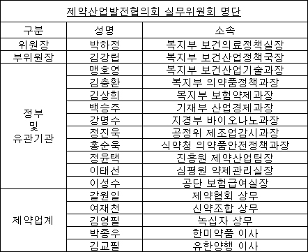 또 제약산업 경쟁력 강화방안을 속도감 있게 진행하기 위해 제약산업 발전협의체 실무위원회를 구성하고 의제별 소위원회도 운영키로 했다.
