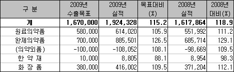 2009년 의약품 수출은 목표치인 16억7000만불을 넘어서는 호실적을 기록했다.