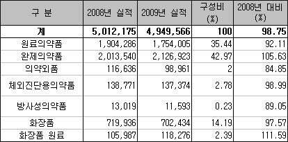 11일 한국의약품수출입협회에 따르면, 2009년 의약품 실적은 19억2432만불로 전년도 16억1786만불에 비해 18.9%가 상승했다.
