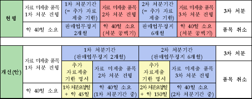 식약청은 생동성 재평가 자료를 제출하지 않음에도 처분공백기에 판매가 가능하다는 문제가 있어, 생동성 재평가 자료 미제출에 따른 1, 2, 3차 행정처분 기간이 연속적으로 이어질 수 있도록 절차를 개선한다고 설명했다.