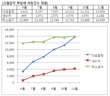 이 같은 추세라면 이번달안에 아모잘탄이 엑스포지를 역전할 것이란 예상이다.