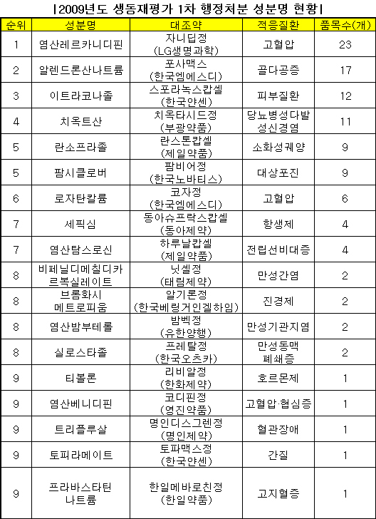 란소프라졸(란스톤캅셀(제일약품))과 팜시클로버(팜비어정(한국노바티스))는 각각 9개, 로자탄칼륨(코자정(한국엠에스디)) 이 6개로 나타났다.