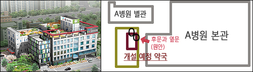 문제의 약국이 설치한 정문·옆문·후문 중 후문과 옆문이 A병원 응급실과 연결돼 있으며 병원 이용객 외에는 도저히 사용할 수 없게 설계 돼 있다.