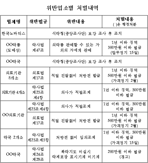 이에 따라 해당 도매상의 경우 약사법 47조 '의약품 판매할 수 있는 자 외의 자에게 판매'로 1년 이하 징역 또는 300만원 이하 벌금과 함께 업무정지 15일의 행정처분이 내려질 예정이다.