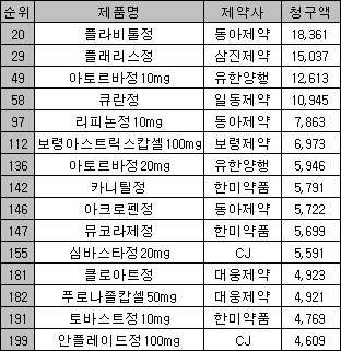 한편 200위권에 진입한 제네릭 제품의 청구액은 총 1198억원으로 상위 200품목의 전체 청구실적 20조 73억원의 6.0%에 그쳤다.