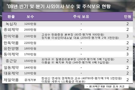 이에 데일리팜은 ’09년 반기보고서를 토대로 상위 10개 제약사들의 ‘사외이사 연봉과 스톡옵션 보유 현황’을 조사한 결과, 녹십자가 6400만원으로 가장 많은 보수를 지급 중외제약과 한미약품이 각각 5200만원과 4600만원으로 그 뒤를 잇고 있는 것으로 나타났습니다.