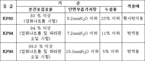 앞서 식약청은 신종플루 유행에 대비 WHO와 유럽 표준 인증 제품과 비교시 동급 이상의 성능을 가진 KF94 등급의 방역용 마스크 규격기준을 마련한 바 있다.