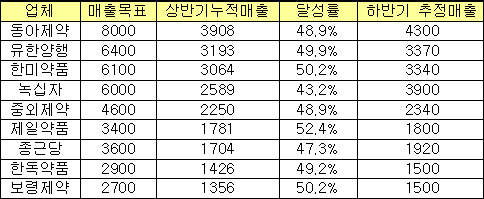 매출 목표액을 보수적으로 잡았던 유한양행(목표액 6400억)은 상반기에 3200억원대 매출로 2위 자리를 굳건히 하고 있다.