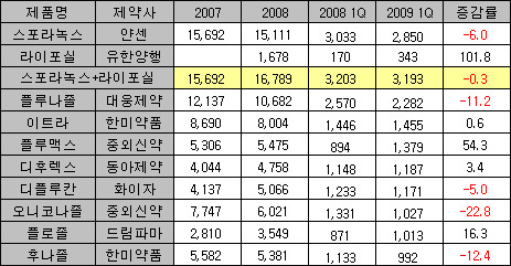 하지만 스포라녹스와 라이포실은 지난해 168억원의 매출을 합작하며 전년대비 7%의 성장률에 그쳤으며 올해 1분기에는 오히려 지난해보다 매출이 감소했다.