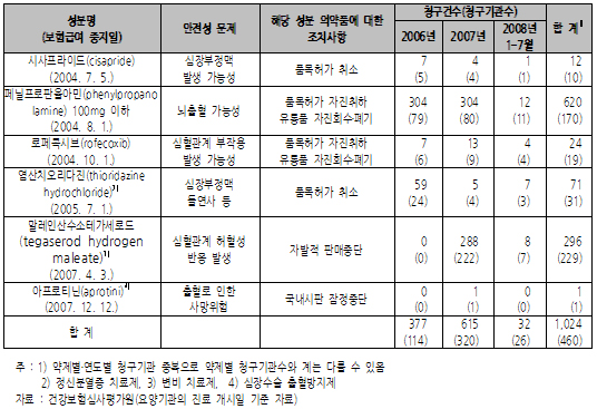 또한 2004년부터 2008년 7월까지 안전성 문제로 사용이 중단된 13개 성분 중 급여가 중단된 '시사프라이드' 등 6개 성분 의약품은 460개 요양기관에 총 1024건이 처방, 조제됐다.