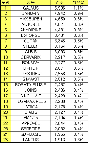 3위는 한미약품의 맥시부펜(4650건), 4위는 제네릭이 쏟아진 사노피의 ‘악토넬’(4621건), 5위는 종근당의 ‘애니디핀’(4481건)이 각각 차지했다.