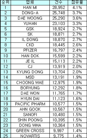 한미약품이 28952건으로 1위를 차지한 가운데, 동아제약이 25748건으로 2위를, 대웅제약이 25290건으로 3위를 기록했다.