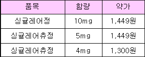 업계에 따르면 현재 싱귤레어츄정 5mg과 싱귤레어정 10mg는 동일 약가를 취득했다.
