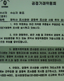 또 공정위 조사관은 조사시 반드시 공문을 제시하고 조사가이드라인(조사받는 기업의 권리고지)을 안내하고 있으며 조사관은 공무원증을 지참하고 있다고 설명했다.