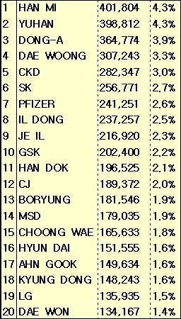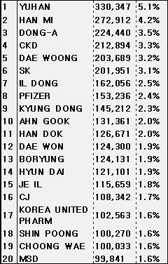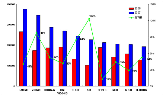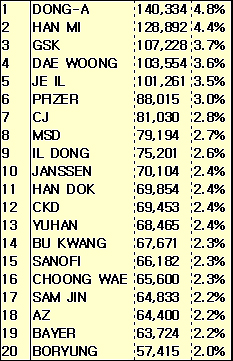 이어 6위 SK케미칼(25만 6771건), 7위 한국화이자(24만 1251건), 8위 일동제약(23만 7257건), 9위 제일약품(21만 6920건), 10위 GSK(20만 2400건) 순으로 상위 10개사 중 8곳이 국내사인 것으로 밝혀졌다.
