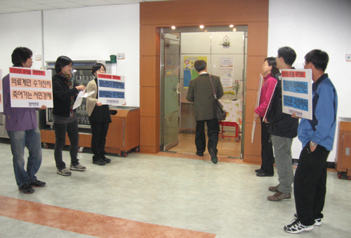 특히 건강연대 등은 재정운영위가 열리는 회의장 앞에서 위원들이 과도한 수가인상을 수용해서는 안된다는 피켓 시위를 벌이는 등 본격적인 행동에 나서는 모습을 연출하기도 했다.