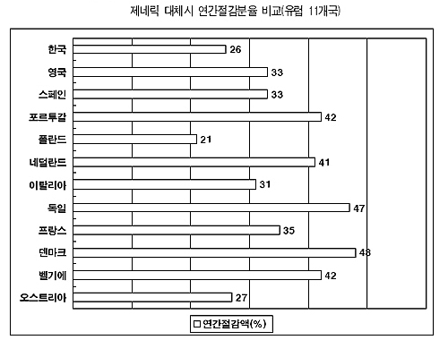 우리나라의 경우 제네릭이 의약품 시장에서 40% 이상의 비중을 차지하고 있음에도 불구하고 상대적으로 높은 가격을 형성하면서 재정절감 효과가 떨어진다는 연구결과가 나왔다.
