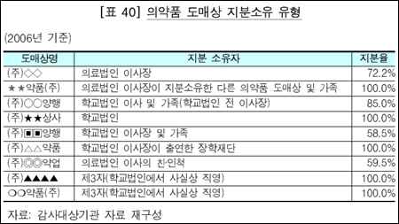 감사원은 의약품 수요자가 도매상을 동시에 소유할 경우 그 관계를 이용해 의약품의 실거래가를 부풀리고 다른 의약품 도매상의 의약품 공급가능성을 차단하는 등 유통질서를 문란하게 할 우려가 크다고 꼬집었다.