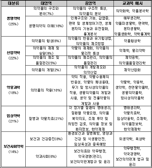 예컨데, 전체 전공교육과정의 25%를 차지하는 ‘생명약학’ 분야의 교과목 예시로는 의약화학과 약품분석학, 해부생리학, 약품미생물학, 면역학, 분자생물학, 약품생화학, 약학통계학 정도가 된다.