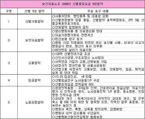 한편 보건노조는 올해 산별중앙교섭 5대 협약으로 ‘임금 10.2% 인상+@’, 산별임금연구 노사공동 TF팀 구성, 사용자단체 법인등록 및 대표성 강화, 영리병원허용 등 영리화 반대, 의료기관평가제도 전면개선, 현장인력 충원 등 을 제시한 바 있다.