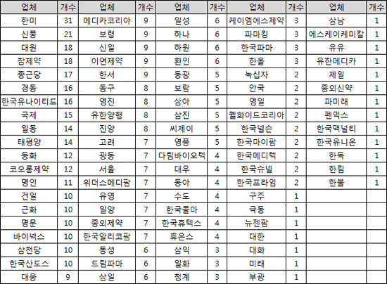 이들 제약사를 포함, 경동제약, 한국유나이티드제약, 국제약품, 일동제약 등 총 20개 제약사가 576품목 가운데 10개 이상을 보유한 것으로 조사됐다.