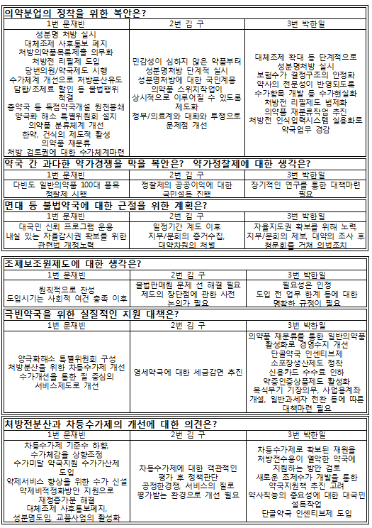 단, 기호 1번 문재빈 후보는 대체조제 사후통보 폐지와 처방약 목록제출 의무화, 당번의원·약국 제도화, 처방 검토권에 대한 수가체계 마련 등의 의견을 추가했다.