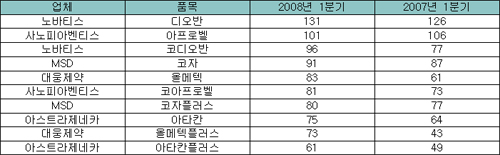 특히 올 1분기 시장을 살펴본 결과 디오반, 코자, 올메텍, 아타칸 등 ARB계열 약물들은 상승세를 그리고 있는 반면, 노바스크, 자니딥, 박사르, 시나롱 등 CCB계열은 하락하고 있어 대조를 이뤘다.