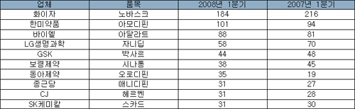 사노피사의 아프로벨(코 아프로벨 포함)도 182억원대 매출로 올해 노바스크를 제칠수 있을지 관심이 모아지는 대목.