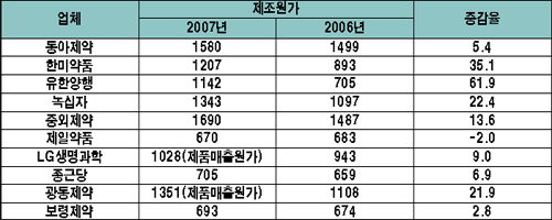 - 10개사 지난해 원가 분석, 한미-동아 수익성 좋아
