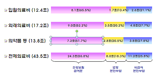 24조3000억원을 제외하면 18%인 8조원이 법정본인부담, 26%인 11조2000억원이 비급여 본인부담 등으로 환자가 요양기관을 이용하며 실제 부담한 비용은 전체 의료비의 44%에 이르고 있는 실정이다.