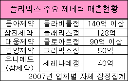 또 ‘플라빅스’ 제네릭을 지난 2006년 9월 최초로 선보인 유니메드(참제약)의 '세레나데'는 40억대, 동아제약과 같은 시기에 나온 진양제약의 ‘크리빅스’는 50억대 매출로 상위 5개 업체에 이름을 올렸다.