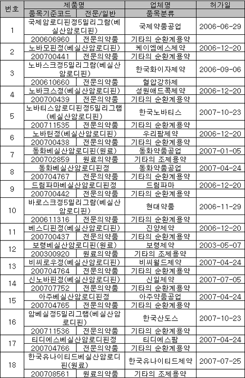 현재 식약청이 생동조건부를 포함해 허가한 ‘베실산암로디핀’ 제네릭은 원료의약품을 제외해도 15품목에 달한다.