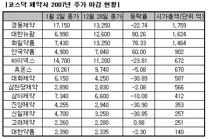 반면 올 초에 비해 주식 값이 하락한 제약회사도 있었다.
