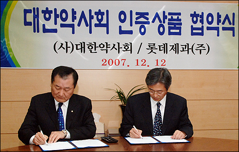 약사회는 12일 오후 약사회관에서 원희목 회장과 롯데제과 김상후 대표이사가 참석한 가운데 약사회 인증상품에 대한 최종 협약식을 진행했다.