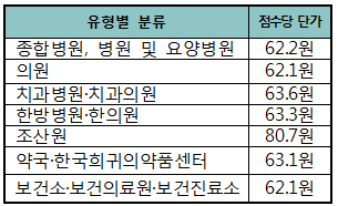 점수당 단가를 보면 병원급 요양기관은 62.2원, 의원급 요양기관은 62.1원, 약국은 63.1원으로 점수당 단가가 변경된다.