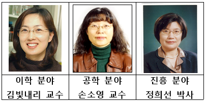 과학기술부는 제7회 ‘올해의 여성과학기술자상’에 서울대 김빛내리 교수(38세), 연세대 손소영 교수(47세), 국립과학수사연구소 정희선 박사(52세)를 선정했다고 9일 밝혔다.