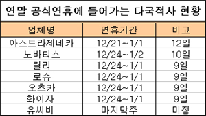 업체별로는 아스트라제네카와 화이자와 로슈, 오츠카 등이 21일까지 마감을 끝내고, 24일부터 내년 1월1일까지 9일을 쉰다. 노바티스는 하루를 더 추가해 24일부터 1월2일 동안 휴무에 들어간다.