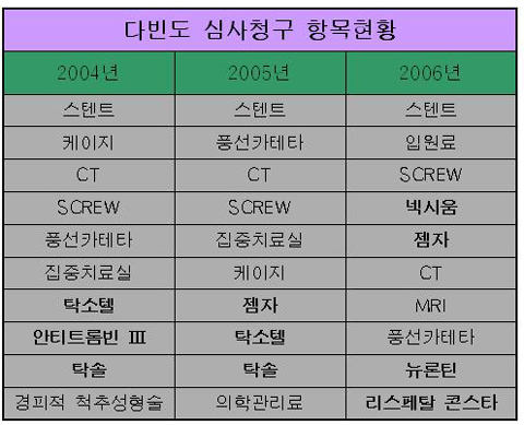 실제로 지난 2004년 전체 약품 가운데 가장 많은 심사청구가 제기된 약은 항암제인 사노피의 '탁소텔'과 BMS제약의 '탁솔주'였으며 2005년에도 릴리의 '젬자' 등이 가장 높은 비중을 기록했다.