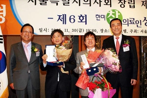한미약품(대표 임선민)과 서울시의사회(회장 문영목)는 30일 저녁 7시 소공동 롯데호텔 3층 사파이어룸에서 올해 수상자로 공동 선정된 노원구청년의사회와 유덕기 원장에 대한 시상식을 갖고 상금 1000만원과 상패를 전달했다.
