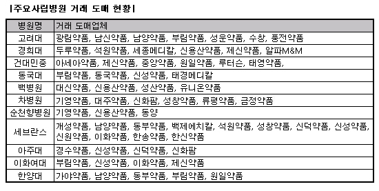 서울 및 수도권 소재 주요사립병원들이 의약품을 거래하는 도매업소의 수가 증가하고 있다.