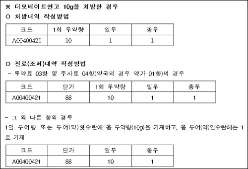 예를 들어 '더모베이트연고 10g'을 처방·조제할 경우 급여명세서 상 투약료(03항), 주사료(04항), 약가(01항)등의 1회 투약량에는 총투약량인 10을 기재하고 1일 투여량과 총투여일수에는 모두 1로 기재해야 한다.