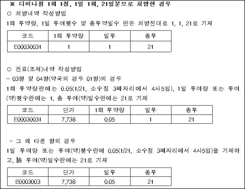 일례로 '디비나정'이 1회 1정, 1일 1회, 21일분이 처방된 경우 진료·조제내역의 1회 투약량에는 0.05(1/21, 소수점 3째자리에서 4사5입), 일투 1, 총투는 21로 명기해야 한다.