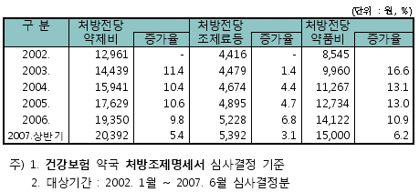 처방전당 약품비는 매년 두 자리 수 이상 급증했다. 2003년에는 전년대비 16.6% 증가했고 2005년에도 13% 상승했고 올해 상반기에도 6.2%로 두 자리수 이상 상승할 것으로 전망된다.