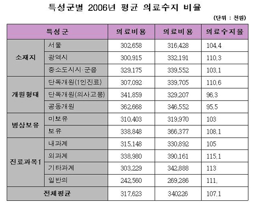 27일 남서울대학교 정두채 교수가 전국 의원 590곳을 대상으로 실시한 2006년 진료수익률 조사에 따르면 시·군·구 등 중소도시 지역 의원들의 연간 평균 진료비 수입은 3억2917만원으로 서울 지역의원에 비해 8.7%가 많은 것으로 조사됐다.