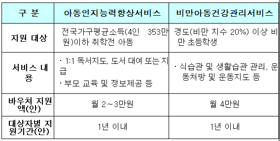 보건복지부(장관 변재진)가 아동 인지능력 향상 및 비만아동 건강관리 등 2개 서비스에 대한 사업자를 모집한다.